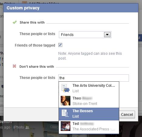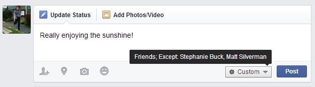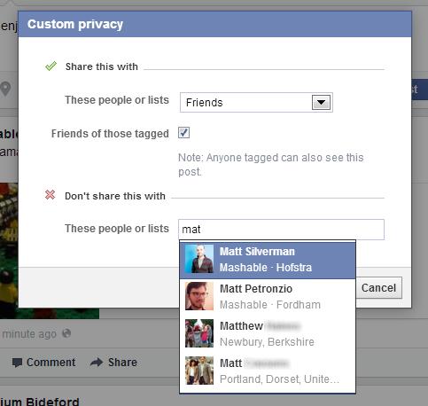 Maintenant, quand vous modifiez les paramètres « Custom » de votre post à cacher, vous pouvez commencer à taper le nom de votre liste pour masquer le contenu aux personnes que vous avez ajouté.