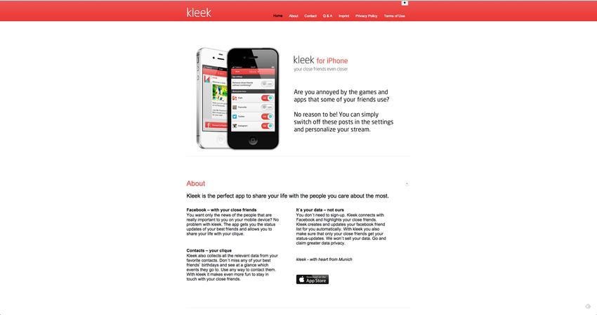 Kleek vous permet de construire votre propre réseau social privé au sein de Facebook, vous donnant seulement les statuts et les données de vos amis les plus proches (si vous utilisez un iPhone).