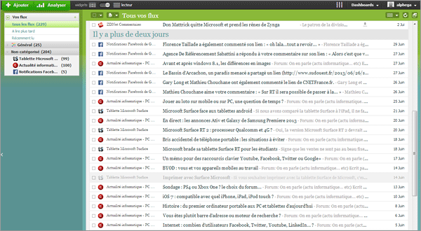 Avec ses nombreuses possibilités, Netvibes ressemble davantage à un portail web qu’un simple lecteur de Flux RSS mais il reste très compétent dans cette tâche. En un clic, vous pouvez passer d’un affichage avec widgets et onglets à une liste des flus RSS compacte, étendue ou en mosaîque avec des images. Une autre bonne nouvelle : il est possible d’importer ses flux Google Reader.