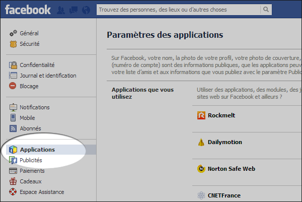 Pour l’instant, les applications ne sont pas concernées par la nouvelle recherche Facebook. Cependant, pour éviter de longues modifications lorsqu’elles seront concernées, vérifiez les permissions actuelles en vous rendant dans les paramètres de confidentialité à la rubrique “Applications” :