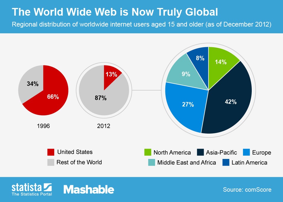 En 1996, 66% des utilisateurs d’Internet provenaient des États-Unis. Dix-sept ans plus tard, le pays représente seulement 13%