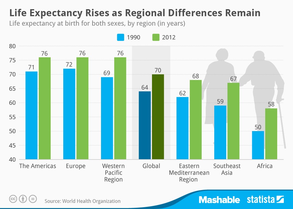 Basée sur des données recueillies en 2012, l’espérance de vie en Amérique, en Europe et dans la Région du Pacifique occidental est supérieure à la moyenne de 76 ans. Toutefois, malgré une amélioration, les régions de la Méditerranée orientale, de l’Asie du Sud-Est et de l’Afrique sont toutes sous la moyenne avec respectivement 68, 67 et 58 ans.