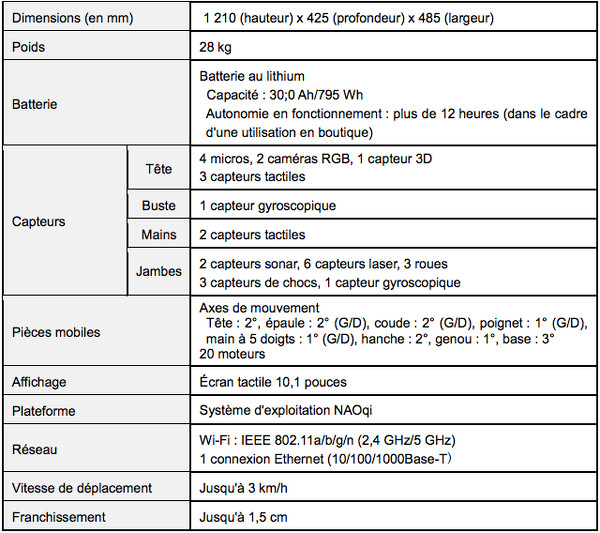 Développé en toute discrétion depuis 2012, le robot Pepper sera commercialisé au Japon dès février 2015. Le robot d’un mètre vingt et de 28 kilos pour une autonomie de 12 heures sera vendu 1500 euros. Il est actuellement possible de tester le robot dans plusieurs magasins Softbank à Tokyo. D’ici sa commercialisation, grâce à des technologies d’apprentissage (machine learning) et une plate-forme d’applications (robot apps), Pepper devrait gagner en intelligence et en fonctionnalités.