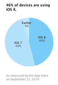 Selon les données publiées sur son site développeurs, près de la moitié (46%) des appareils mobiles d’Apple qui ont accédé à l’App Store le 21 septembre l’ont fait en utilisant iOS 8. C’était quatre jours après la sortie d’iOS 8 et deux jours après la commercialisation de l’iPhone 6 et de l’iPhone 6 Plus.