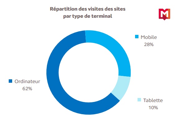 Selon son dernier rapport eStat’Web, 62% des accès aux sites internet mesurés par Médiamétrie ont été effectués depuis un ordinateur ((fixe ou portable) en septembre 2014. 28% des accès sont fait depuis un smartphone et 10% depuis une tablette.