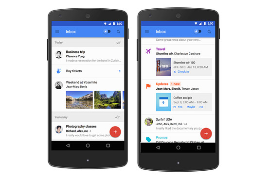C’est par son blog que Google a annoncé Inbox, une messagerie à l’interface minimaliste et au look d’Android 5.0 « Lollipop » qui reprend le concept des catégories de tri automatique déjà présent dans Gmail. Les notifications des réseaux sociaux ou les factures seront donc acheminées dans une catégorie spécifique. Il sera bien évidemment possible d’en créer des nouvelles.