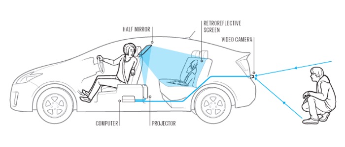 En fait, les chercheurs ont positionné plusieurs caméras autour du véhicule qui, reliées à un système de vidéo projecteur, transmettent l’image extérieure sur les sièges, les portières, l’habitacle et même les passagers.