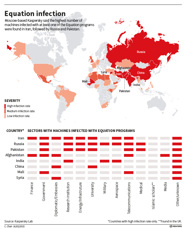 Dans un rapport publié mardi, la société de sécurité Kaspersky a mis au jour un groupe de pirates baptisé «Equation», un groupe qui a infecté des milliers de victimes dans plus de 30 pays dans le monde depuis 2001.