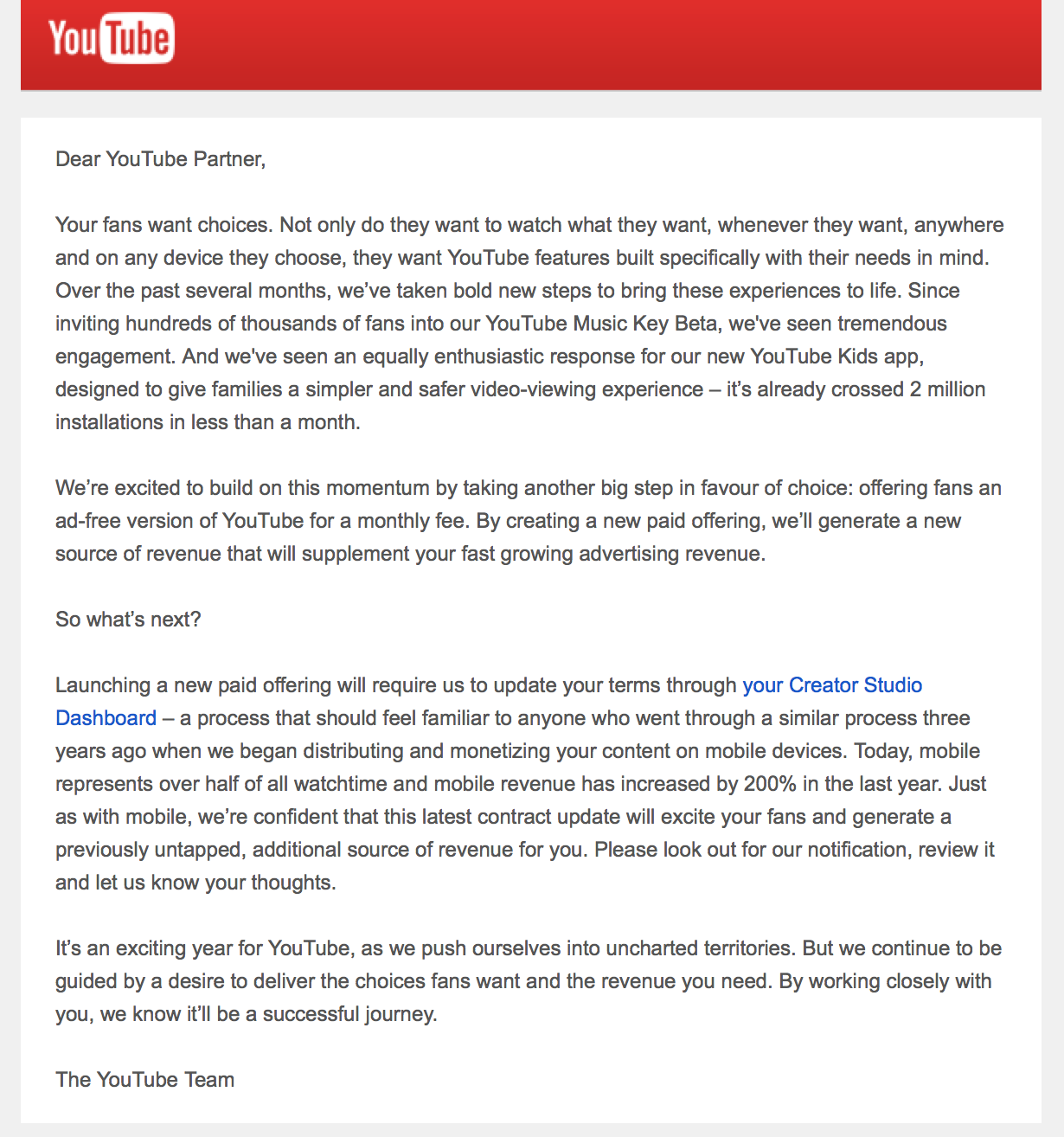 Aujourd’hui, la société a envoyé un email aux créateurs de contenu qui leur annonce le lancement imminent de l’offre.