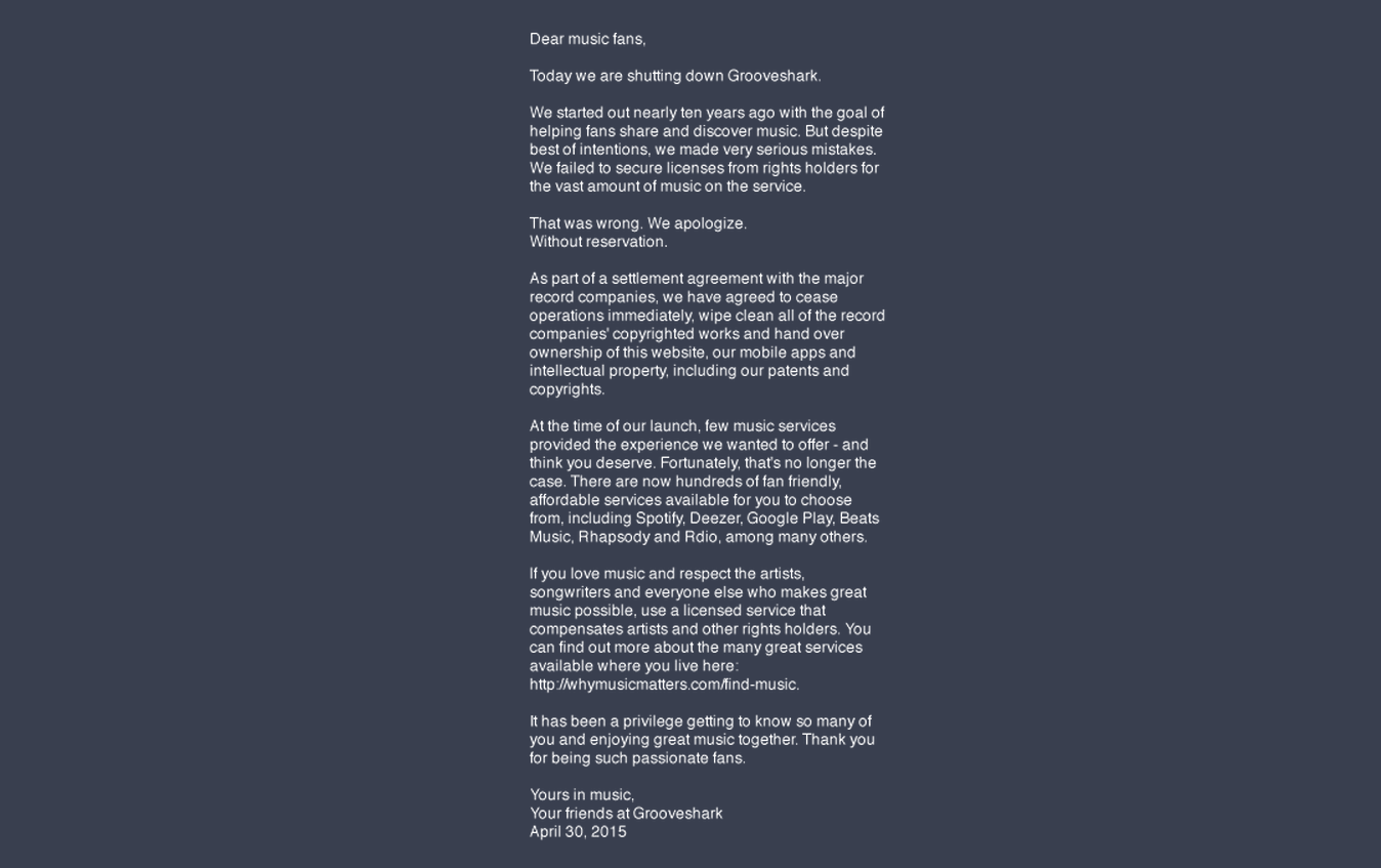 Grooveshark a été l’un des premiers services en ligne à permettre l’écoute de musique, sans aucune limite et publicité. Mais après 9 ans d’existence, le site a été contraint de fermer ses portes et ne reviendra pas, expliquait un communiqué sur la page d’accueil.
