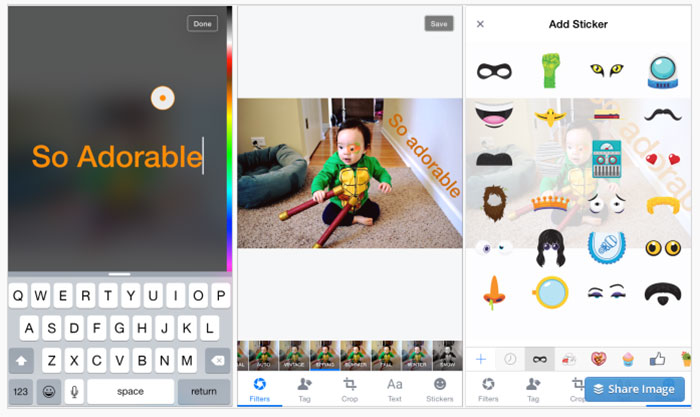Ce mode de personnalisation est intégré à la fonction d’upload photos, qui ressemble à présent à celle de Snapchat. Les utilisateurs qui en bénéficient voient apparaître une ligne verticale lorsqu’ils rédigent un statut. Cette ligne propose d’ajouter un filtre, de taguer ses contacts, de découper l’image, d’ajouter du texte ou d’y inclure un autocollant.