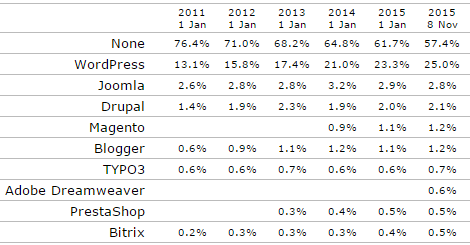 Avec son étude, W3Techs a publié un tableau affichant l’évolution de la part de marché depuis janvier 2011 à novembre 2015.