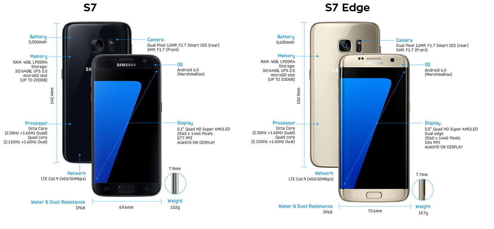 De son côté, le S7 Edge dispose d’un écran Super AMOLED QHD de 5,5 pouces (2 560 x 1 440) avec un Snapdragon 820 ou un Exynos 8890 couplé à 4 Go de RAM. L’espace de stockage proposé sera de 32 Go et 64 Go. Comme le S7, il embarque un port micro SD permettant une extension de l’espace jusqu’à 200 Go. Côté photo, on retrouve également un capteur de 12 millions de pixels avec une ouverture de f/1.7. En façade, le fabricant a installé une caméra de 5 millions de pixels. Son autonomie est assurée par une batterie de 3 600 mAh qui bénéficie aussi de la charge rapide filaire et sans fil.
