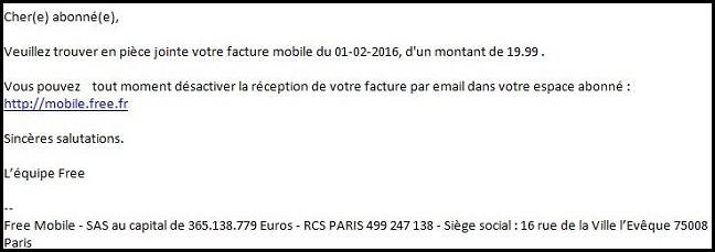 Dans l’hexagone, le ransomware se ferait passer pour une facture provenant de l’opérateur Free Mobile. Il reprend trait pour trait l’allure des e-mails de facturation envoyés par Free, y compris l’adresse [email protected].. De plus, il suffit de cliquer sur la pièce jointe ressemblant à un fichier PDF pour ouvrir en réalité une archive (.zip) qui contient un script permettant le téléchargement de Locky.