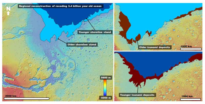 Cependant, le chercheur J. Alexis Rodriguez et ses collègues ont trouvé des traces des deux méga tsunamis en étudiant les cartes de Arabia Terra et Chryse Planitia, deux plaines situées dans la région nord de Mars. Les images infrarouges prises par la sonde Mars Odyssey ont révélé des filigranes sur les plaines qui ressemblaient à des lignes de côtes.