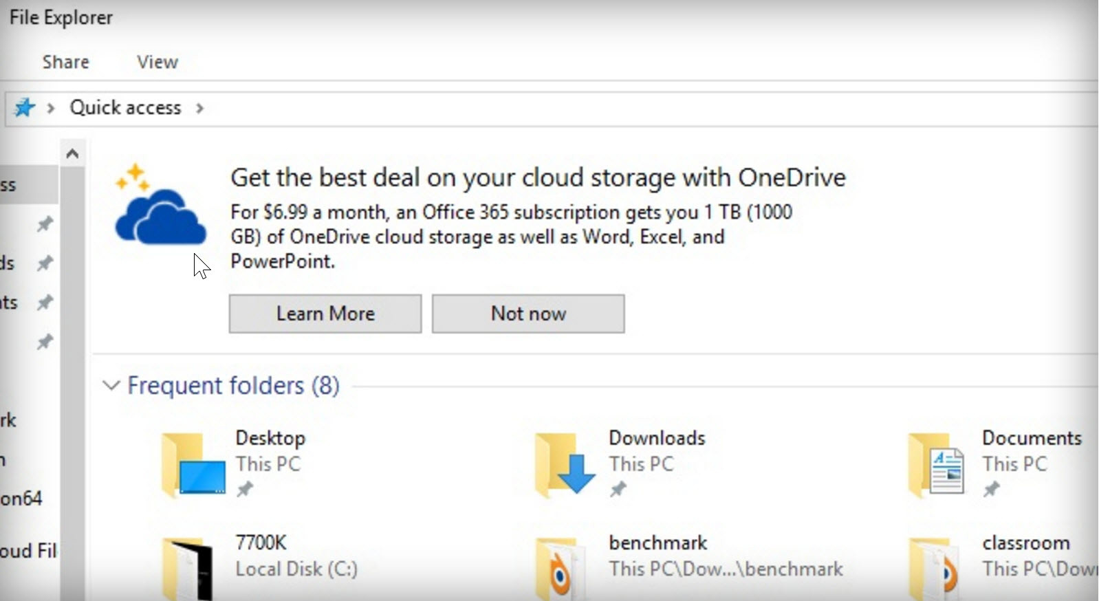 Contrairement aux versions précédentes de Windows qui nécessitaient une installation distincte de OneDrive, Windows 10 embarque le service de stockage cloud de Microsoft directement dans le système d’exploitation. Peut-être un peu trop. Alors qu’il a été apparemment déjà repéré il y a quelques mois, les utilisateurs signalent actuellement un taux croissant de bannières publicitaires figurant en haut de l’Explorateur de fichiers.