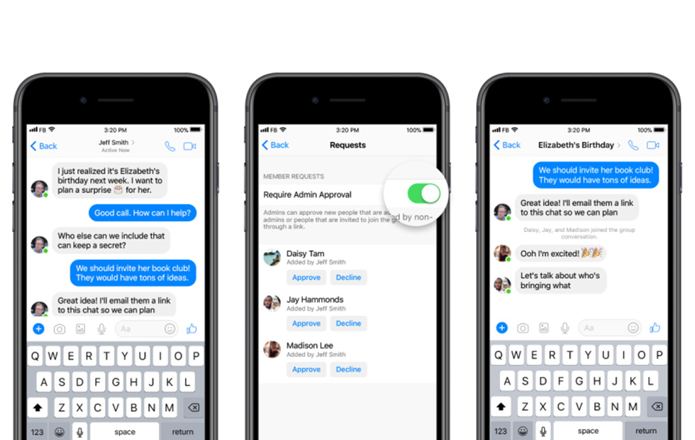 Selon Facebook, 2,5 millions de groupes supplémentaires ont été créés sur Messenger par jour en 2017. Cette popularité a attiré l’attention de Facebook, qui a finalement décidé d’ajouter de nouvelles capacités aux discussions de groupe, la principale étant des privilèges d’admin. Lorsqu’ils sont sollicités, les administrateurs peuvent approuver de nouveaux membres, en modérant l’accès à la conversation.