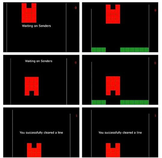 Les trois sujets ont été liés pour jouer à un jeu simple du style Tetris. Les émetteurs, qui pouvaient voir l’ensemble de l’écran, se concentraient sur une LED clignotante de 15Hz s’ils souhaitaient faire pivoter l’une des pièces. Cela générerait des ondes cérébrales à la même fréquence, qui seraient transmises au récepteur. Cette personne, qui ne pouvait voir que les pièces qui tombaient, reçoit les signaux, qui sont ensuite convertis par la stimulation magnétique transcrânienne en un point de lumière dans leur vision, indiquant que le bloc doit être tourné.