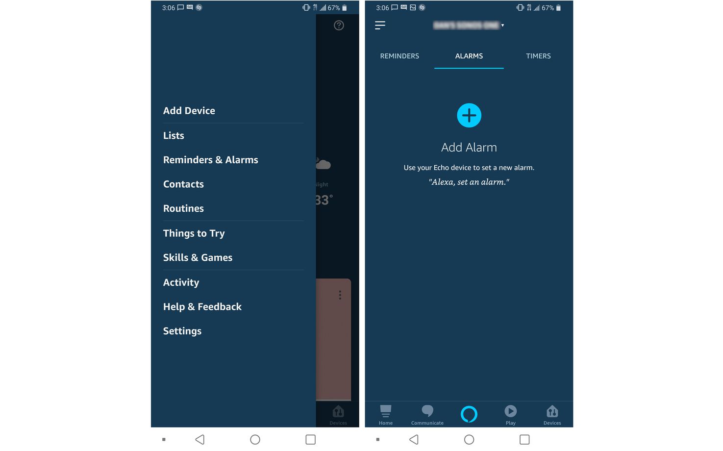 3/ Choisissez votre appareil en partant du haut. Si vous avez plusieurs appareils compatibles avec Alexa, appuyez sur Plus (+) pour configurer votre alarme.
