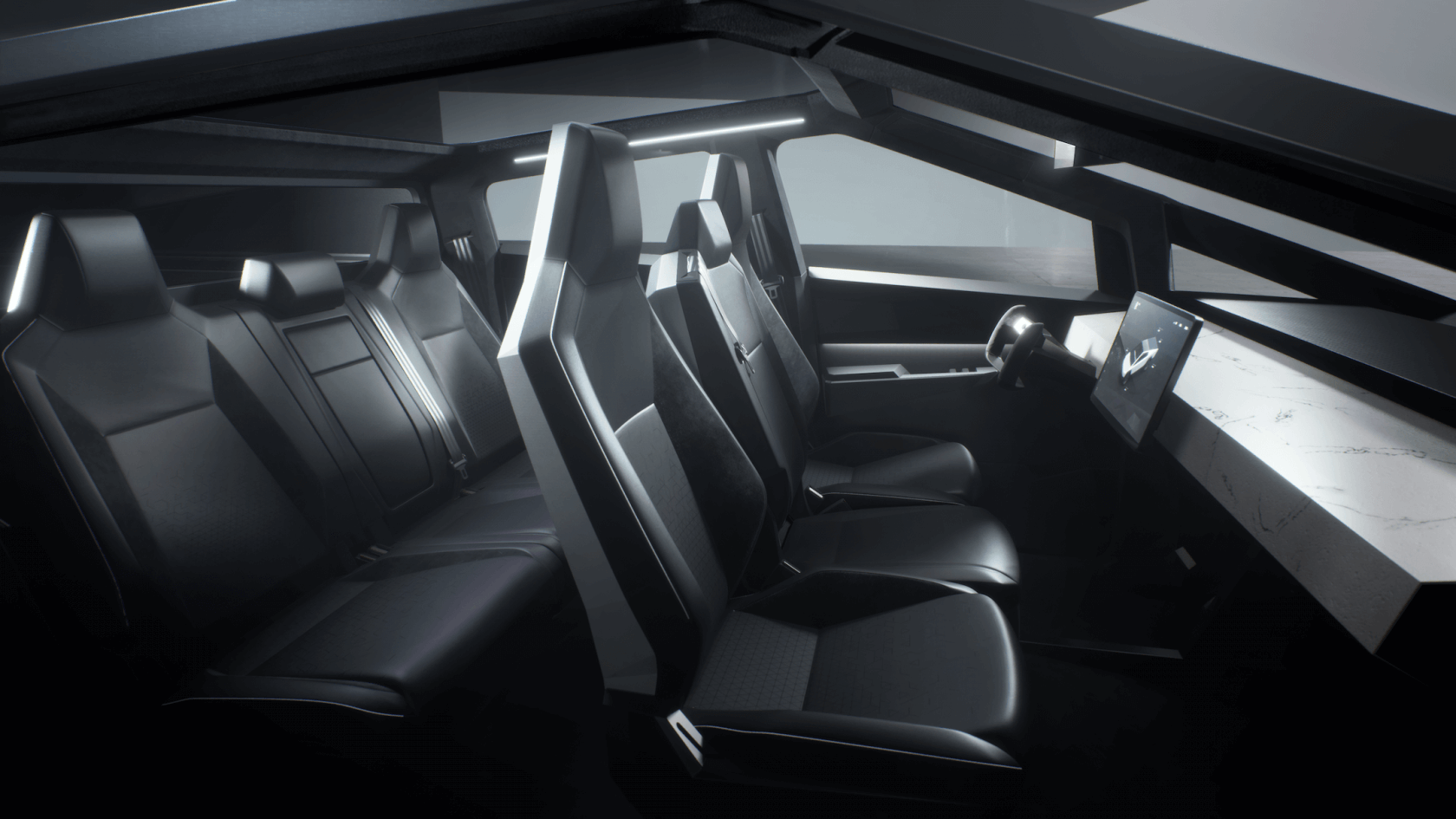 Au lieu de cela, une grande plaque de métal glisse vers le haut (apparemment dans le toit de la voiture) pour révéler son espace de chargement arrière, appelé à juste titre le « Coffre-fort ». Vous pouvez laisser cette plaque de protection ouverte si vous transportez une cargaison volumineuse (comme le Tesla ATV Musk brièvement teasé), ou vous pouvez la fermer pour améliorer la sécurité. Le coffre-fort est d’environ 2 mètres de longueur, avec 2,80 mètres cubes d’espace de stockage vide.