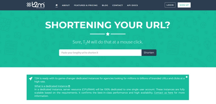 T2M a des instances dédiées, ce qui signifie que la réponse du serveur sera 100% dédiée à un seul utilisateur. Cela garantit une redirection rapide vers votre URL de destination. Vous pouvez créer des URL de marque courtes qui génèrent plus de clics ou même décider où le lien doit fonctionner.