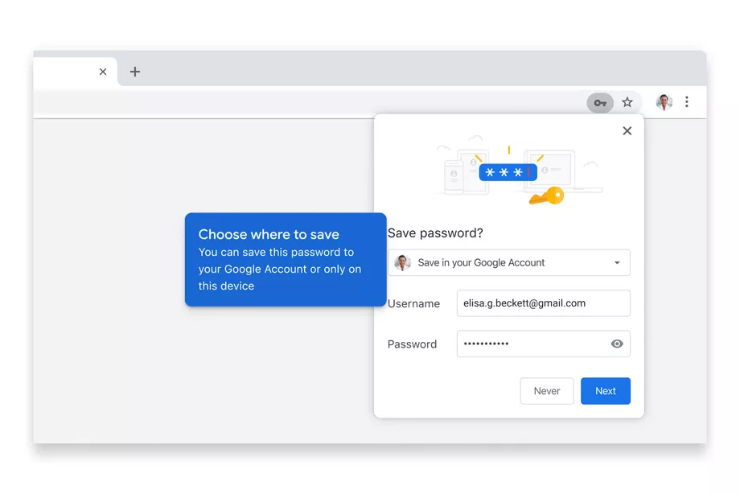 La version desktop de Chrome est également en cours de mise à jour pour donner accès aux mots de passe enregistrés si vous êtes connecté avec un compte Google. Lorsque vous enregistrez un nouveau mot de passe, Chrome offre la possibilité de l’enregistrer sur l’appareil ou dans un compte Google pour avoir accès à tous les appareils.